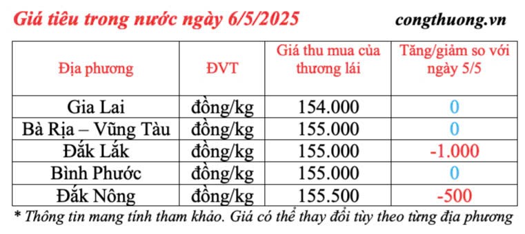 | Giá tiêu trong nước cập nhật sáng ngày 6/5/2025 |