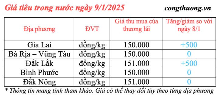 | Giá tiêu trong nước cập nhật ngày 9/1/2025 |