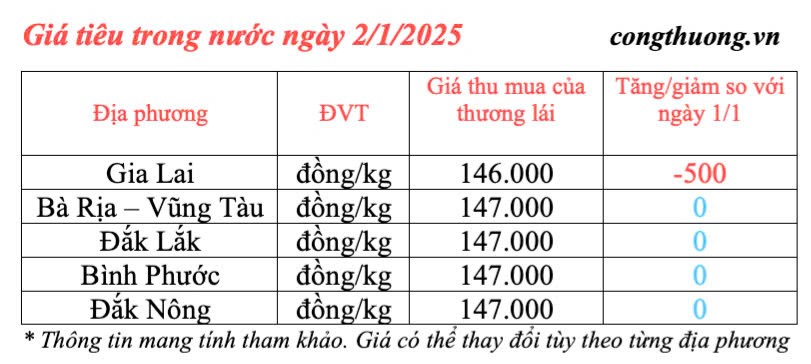 | Giá tiêu trong nước cập nhật ngày 2/1/2025 |