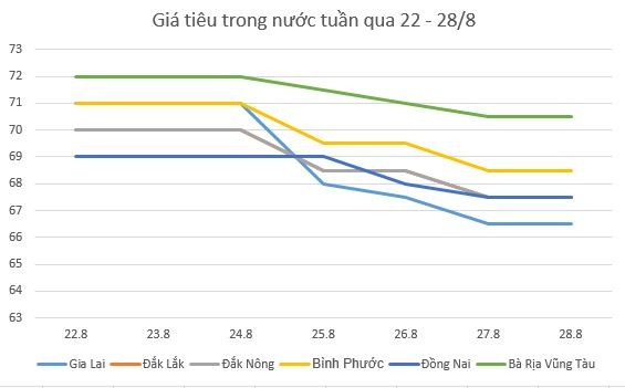 Giá tiêu hôm nay 28/8 tại các vùng trồng trọng điểm duy trì ổn định so với hôm qua. Cụ thể, tại tỉnh Đắk Lắk, Đắk Nông giá tiêu hôm nay được thu mua với mức 67.500 đồng/kg. Tại Gia Lai giá tiêu hôm nay được thu mua với mức 66.500 đồng/kg. Tại Bình Phước, giá tiêu hôm nay được thu mua với mức 68.500 đồng/kg. Tại tỉnh Bà Rịa - Vũng Tàu giá tiêu hôm nay ở mức 70.500 đồng/kg. Tại Đồng Nai, giá tiêu hôm nay ở mức 67.500 đồng/kg.