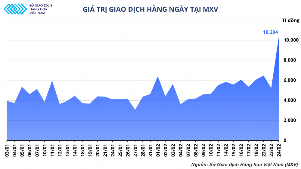 Theo Khối Quản lý Giao dịch MXV, giá trị giao dịch hàng hóa trong ngày 24/02/2022 đạt 10.294 tỷ đồng. Trong đó, nhóm các mặt hàng nông sản chiếm 49% và nhóm năng lượng chiếm 30% dòng tiền của các nhà đầu tư trong nước. MXV hiện nay đang niêm yết giao dịch 31 mặt hàng với 38 loại hợp đồng kỳ hạn (kỳ hạn tiêu chuẩn, mini và micro). Trong đó, nhóm nông sản gồm các mặt hàng liên thông với Sở Chicago như ngô, đậu tương, khô đậu tương, dầu đậu tương, lúa mì Chicago, lúa mì Kansas và gạo thô. Nhóm năng lượng bao gồm dầu thô WTI, xăng pha chế RBOB, khí tự nhiên liên thông với Sở NYMEX và dầu thô Brent, dầu ít lưu huỳnh liên thông với Sở ICE.