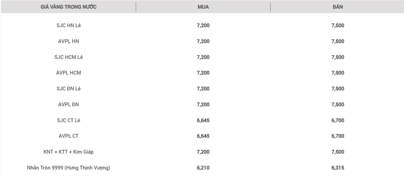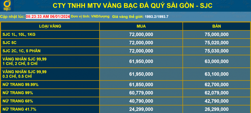 Tại thời điểm 21h ngày 7/1/2024, giá vàng SJC trong nước neo mốc 72 triệu đồng/lượng mua vào và 75 triệu đồng/lượng bán ra. Tại Công ty TNHH MTV Vàng Bạc Đá quý Sài Gòn, doanh nghiệp này niêm yết giá vàng SJC ở mức 72 triệu đồng/lượng mua vào và 75 triệu đồng/lượng bán ra. Chênh lệch giá mua - bán vàng SJC giữ nguyên ở mức 3 triệu đồng/lượng.