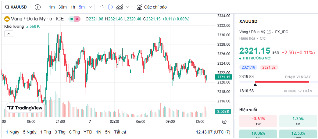 Thời điểm trưa ngày 7/5, giá vàng thị trường thế giới tăng nhẹ, giao quanh ngưỡng 2.321 USD/ounce.Quy đổi sang VND, giá vàng thế giới có mức giá là 71,1 triệu đồng/lượng, thấp hơn vàng SJC 16,4 triệu đồng/lượng, thấp hơn vàng nhẫn 4,5 triệu đồng/lượng. Chênh lệch giá vàng mua và bán tăng cao khiến người mua vàng đối mặt rủi ro.