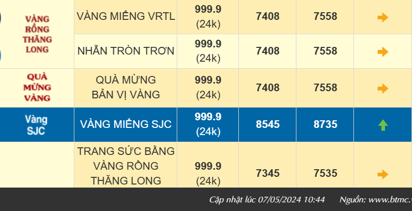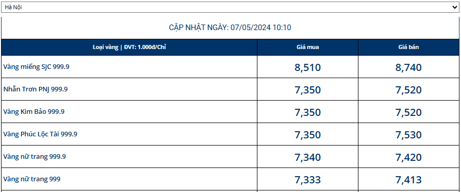 Giá vàng miếng SJC tăng thêm 1,2 triệu đồng/lượng và vượt xa mốc 87 triệu đồng/lượng. Đến thời điểm trưa ngày 7/5, giá vàng miếng SJC tại Tập đoàn Phú Quý được giao dịch mua vào - bán ra quanh mức 85,40 - 87,40 triệu đồng/lượng, tăng 1,6 triệu đồng/lượng chiều mua và tăng 1,4 triệu đồng/lượng chiều bán so với ngày hôm qua.