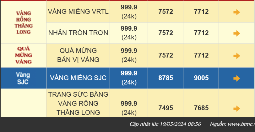 Công ty Vàng bạc đá quý Sài Gòn niêm yết giá vàng SJC ở mức 87,70 - 90,40 triệu đồng/lượng (mua vào - bán ra); tăng 200 nghìn đồng/lượng ở chiều mua vào và tăng 400 nghìn đồng/lượng ở chiều bán ra so với cùng thời điểm ngày 18/5.