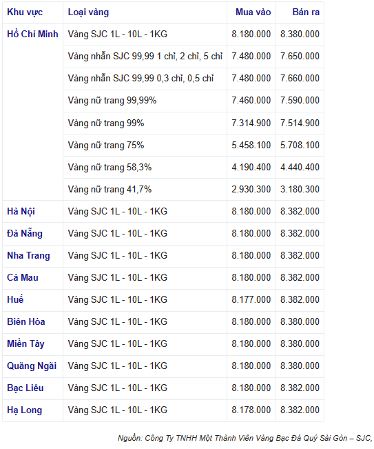 Giá tại Công ty Vàng bạc đá quý Sài Gòn khu vực Hà Nội quanh mức 81,80 - 83,82 triệu đồng/lượng, tăng 100 ngàn đồng/lượng chiều mua và tăng 100 ngàn đồng/lượng chiều bán so với hôm qua. Chênh lệch mua - bán là 2 triệu đồng/lượng.