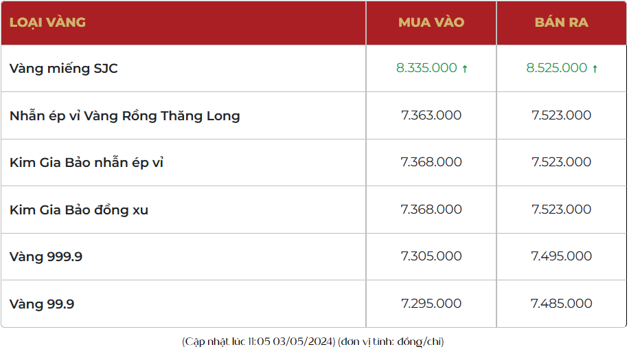 Giá vàng miếng SJC hôm nay tăng 350 ngàn đồng/lượng. Đến thời điểm trưa ngày 3/5, giá vàng miếng SJC tại Tập đoàn Phú Quý được giao dịch mua vào - bán ra quanh mức 83,30 - 85,30 triệu đồng/lượng, tăng 400 ngàn đồng/lượng chiều mua và tăng 400 ngàn đồng/lượng chiều bán so với ngày hôm qua.