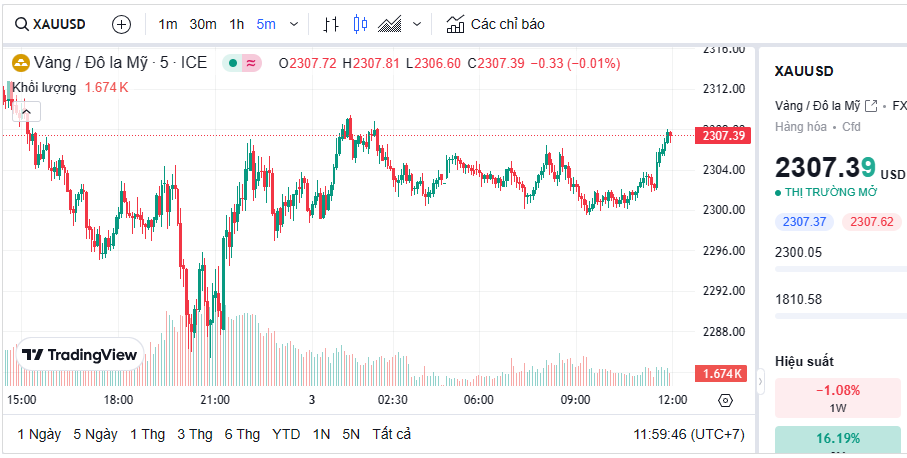 Giá vàng thế giới giảm trở lại xuống 2.307 USD/ounce, thấp hơn hôm qua 19 USD. Quy đổi theo tỉ giá Vietcombank, hiện kim loại quý đang ở mức 70,7 triệu đồng/lượng (chưa bao gồm thuế, phí). Như vậy, chênh lệch giữa giá vàng SJC trong nước và thế giới vào khoảng 13,83 triệu đồng/lượng.
