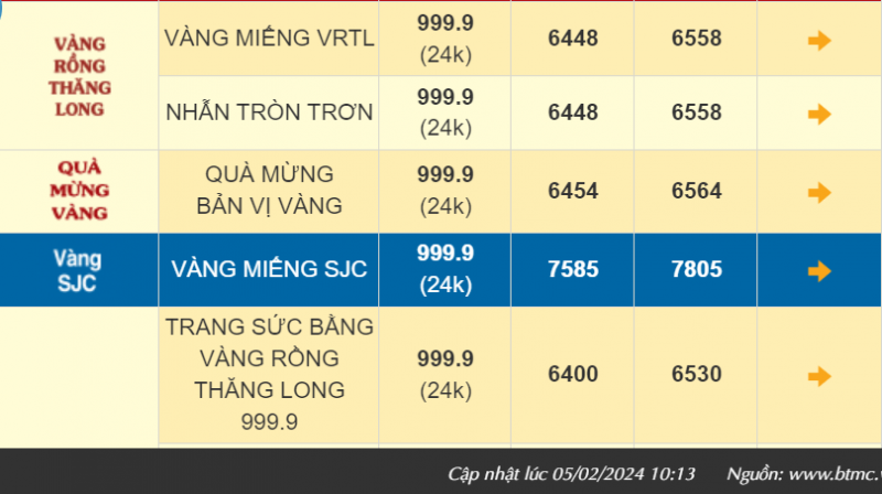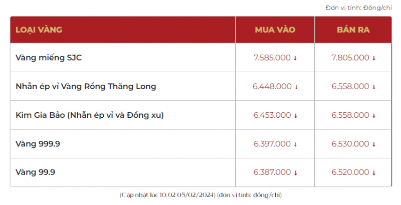 Thời điểm trưa ngày 5/2/2024, giá vàng SJC tại Công ty Doji Hà Nội giao dịch ở mức 75,85-78,15 triệu đồng/lượng mua vào - bán ra, giảm 200 ngàn đồng/lượng chiều mua vào và giảm 150 ngàn đồng/lượng chiều bán ra so với ngày hôm qua.