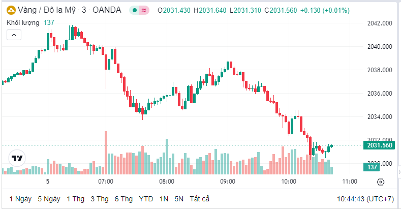 Lúc hơn 11h sáng theo giờ Việt Nam, giá vàng giao ngay tại thị trường châu Á đứng ở mức 2.031,1 USD/oz, giảm 8,6 USD/oz so với đóng cửa cuối tuần trước tại thị trường New York - theo dữ liệu từ sàn giao dịch Kitco. Mức giá này tương đương khoảng 60,3 triệu đồng/lượng nếu được quy đổi theo tỷ giá USD bán ra tại ngân hàng Vietcombank.