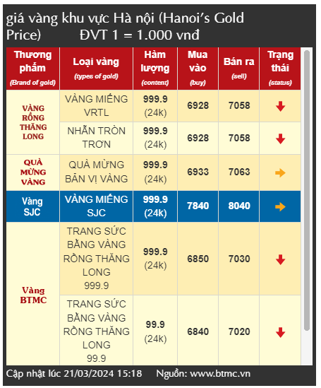 | Giá vàng niêm yết tại Bảo Tín Minh Châu. Ảnh chụp website màn hình lúc 16h00 ngày 21/3/2024 |