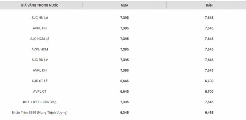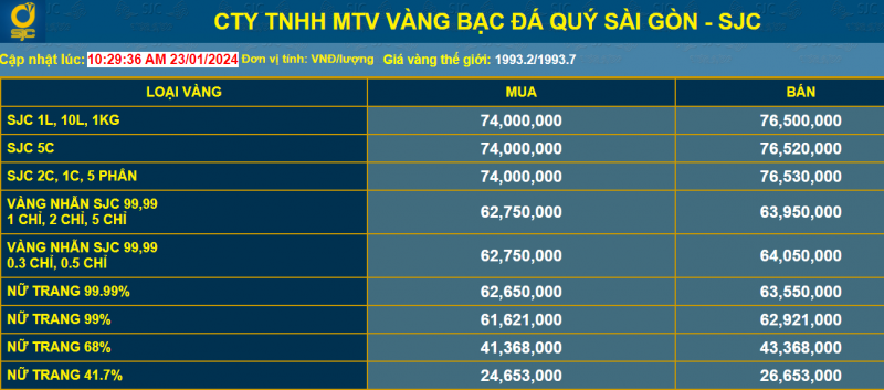 Thời điểm 11h30 ngày 23/1/2024, giá vàng SJC trong nước đã tăng giá, sau khi giảm vào rạng sáng cùng ngày. Tại Công ty TNHH MTV Vàng Bạc Đá quý Sài Gòn - SJC niêm yết giá vàng SJC chiều mua vào ở mức 74 triệu đồng/lượng và bán ra ở mức 76,5 triệu đồng/lượng.