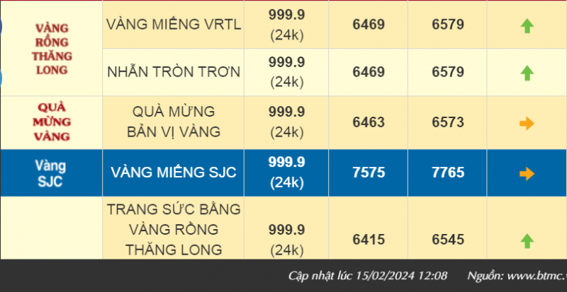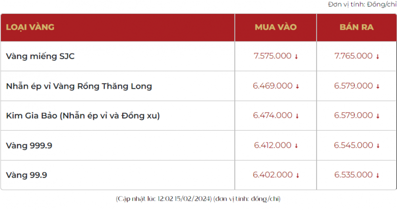 Giá vàng giao dịch lúc trưa ngày 15/2 (mùng 6 Tết), giá vàng SJC được Tập đoàn DOJI giao dịch ở mức giá 76,30 - 77,60 triệu đồng/lượng mua vào, bán ra, giảm khoảng 900 ngàn đồng so với trước kỳ nghỉ Tết Nguyên đán Giáp Thìn.