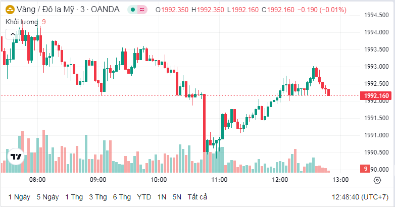 Trên thị trường vàng thế giới, giá vàng giao ngay chốt phiên hôm qua tại Mỹ giảm nhẹ 0,8 USD xuống 1.991,9 USD/ounce. Sang phiên châu Á sáng nay, giá vàng đi ngang và tạm đứng tại mức 1.992 USD/ounce.