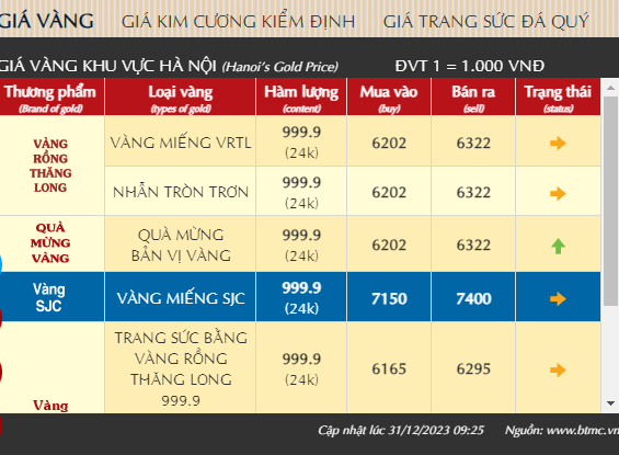 Vàng trang sức bằng Vàng rồng Thăng Long 999.9 (vàng 24k) của Công ty TNHH Bảo Tín Minh Châu giao dịch quanh mức 62,02 - 63,22 triệu đồng/lượng mua vào - bán ra, tang 320 ngàn đồng/lượng chiều mua vào và 250 ngàn đồng/lượng chiều bán ra so với hôm qua. Vàng trang sức bằng Vàng rồng Thăng Long 999.9 (vàng 24k) đang giao dịch quanh mức 61,65 - 62,95 triệu đồng/lượng mua vào - bán ra, bằng giá chiều mua vào và chiều bán ra so với ngày hôm qua.