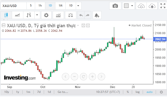 Trên thị trường thế giới, giá vàng hôm nay đóng cửa năm 2023 ở mức 2.063 USD/ounce, tăng 239 USD so với hồi đầu năm. Tính trong năm nay, giá vàng hôm nay tăng trên 13%. Nhận định về xu hướng giá vàng trong tuần đầu tiên của năm 2024, giới phân tích cho rằng giá vàng sẽ tiếp tục đi lên.