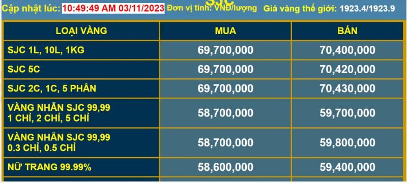| Giá vàng tại SJC niêm yết lúc 11h ngày 3/11 |