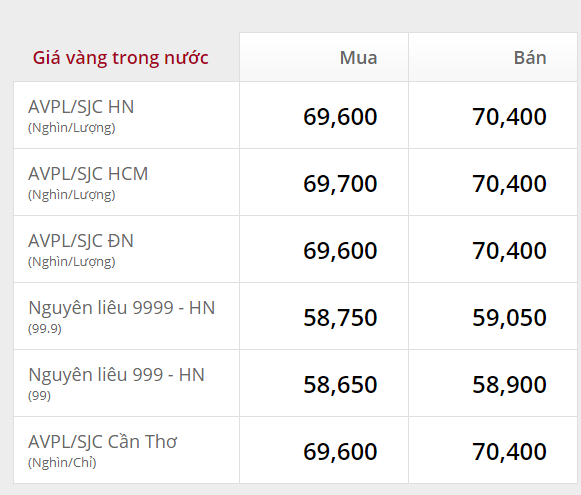 Trưa nay (3/11), giá vàng trong nước đã nối tiếp đà giảm so với phiên giao dịch sáng cùng ngày. Thời điểm khảo sát lúc 11h trưa nay (3/11), giá vàng SJC khu vực Hà Nội, Đà Nẵng đang niêm yết ở mức mua vào là 69,7 triệu đồng/lượng, giảm tiếp 250.000 đồng so với thời điểm rạng sáng; giá bán ra là 70,4 triệu đồng/lượng cùng giảm tiếp 250.000 đồng so với sáng nay. Như vậy, so với ngày hôm qua (2/11), trưa nay, giá vàng trong nước giảm và lao dốc không phanh, giảm đến 550.000 đồng/lượng.