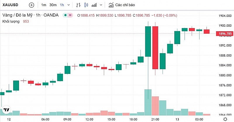 Theo Reuters, giá vàng đã bật tăng mạnh trong phiên giao dịch vừa qua, có thời điểm tăng vượt mức quan trọng 1.900 USD/ounce, sau khi dữ liệu Chỉ số giá tiêu dùng (CPI) cho thấy dấu hiệu lạm phát ở Mỹ hạ nhiệt, góp phần thúc đẩy kỳ vọng vào khả năng Cục Dự trữ Liên bang Mỹ (Fed) sẽ tăng lãi suất chậm hơn.