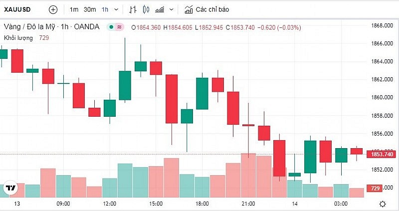 Trong khi đó, vàng thế giới cũng quay đầu giảm, hiện ở mốc 1.853 USD.