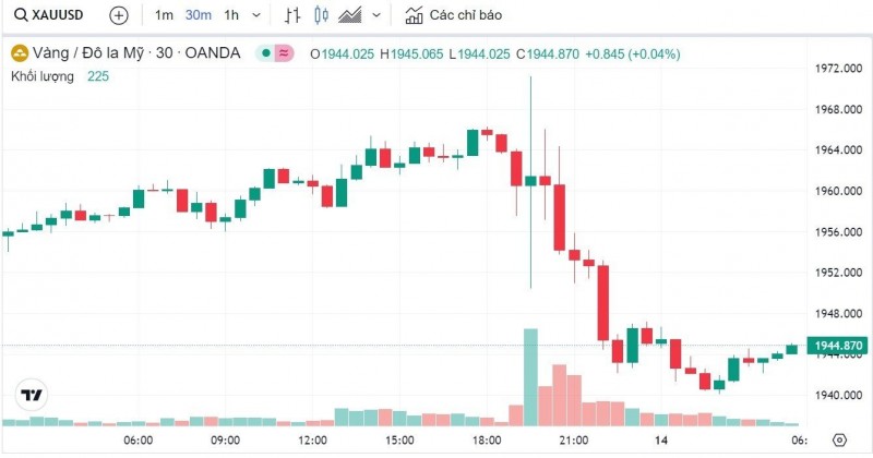 Trong khi đó, vàng thế giới giảm mạnh, hiện ở mốc 1944 USD.
