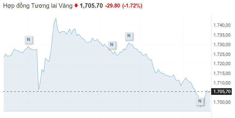 Trên thế giới, giá vàng giao ngay giảm xuống 1.714 USD/ounce. Giá vàng đã giảm mạnh hơn 1% trong phiên giao dịch chiều ngày thứ 5 (14/7) xuống gần đáy một năm, đồng USD mạnh sau khi lạm phát nóng tại Mỹ củng cố triển vọng về một đợt tăng lãi suất nữa từ Cục Dự trữ Liên bang Mỹ (Fed).