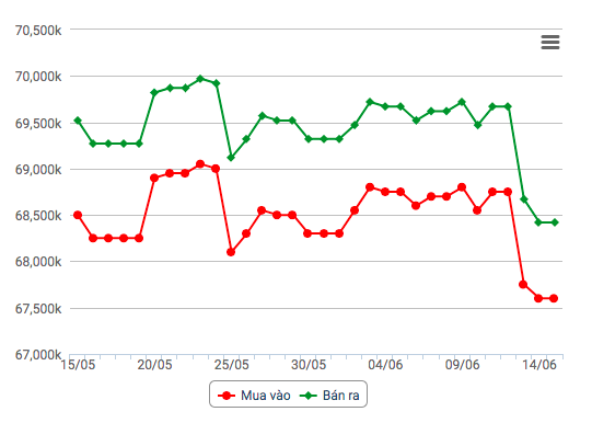 | Giá vàng hôm nay 14/6: Vàng SJC mua vào đứng mốc 67 triệu đồngGiá vàng hôm nay 15/6: Vàng giảm về ngưỡng 66 triệu/lượng |