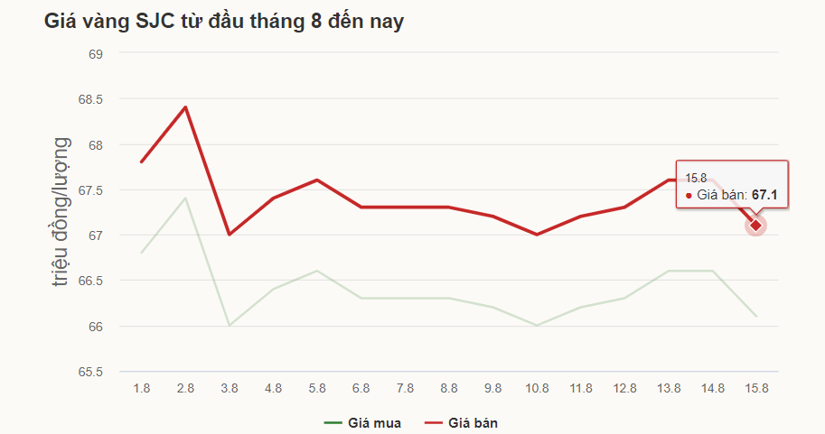 | Giá vàng hôm nay 13/8: Vàng SJC đã lấy lại mốc 67 triệu đồngGiá vàng hôm nay 14/8: Vàng tăng nhẹ 100.000 đồng/lượngGiá vàng hôm nay 15/8: Giá vàng SJC mua vào 66 triệu đồng |