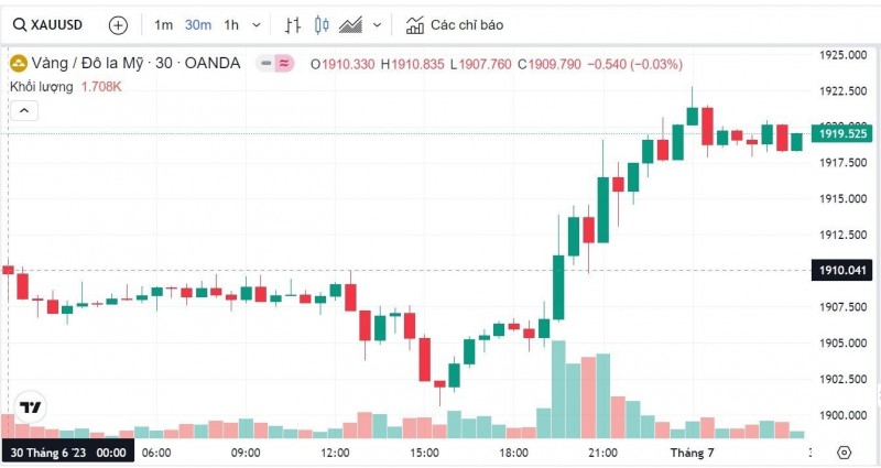 Giá vàng tăng sau dữ liệu về Chi tiêu tiêu dùng cá nhân của tháng 5 của Mỹ được công bố, thúc đẩy các nhà giao dịch đặt cược rằng Fed ít bị ràng buộc hơn trong việc tăng lãi suất vào tháng 7.