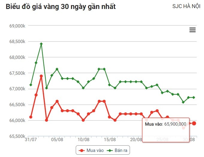 Công ty Vàng bạc đá quý Sài Gòn niêm yết giá vàng SJC tại thị trường Hà Nội ở mức 65,90 triệu đồng/lượng chiều mua vào, 66,67 triệu đồng/lượng bán ra.
