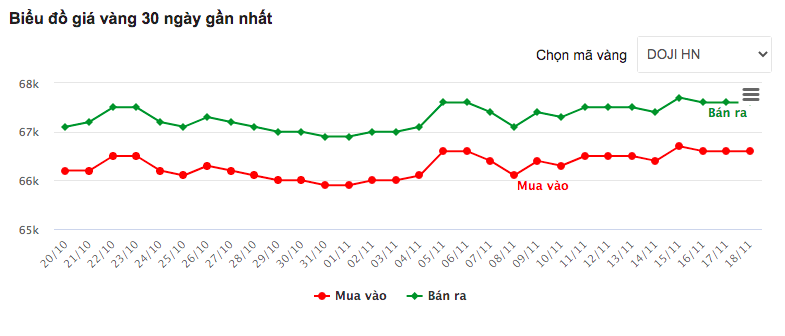 | Giá vàng hôm nay 16/11: Giá vàng 9999 tăngGiá vàng hôm nay 17/11: Vàng giữ ngưỡng hơn 67 triệu đồng/ lượng bán raGiá vàng hôm nay 18/11: Vàng 9999 đi ngang |