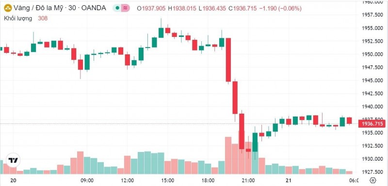 Trong khi đó, vàng thế giới lao dốc, xuống mốc 1936 USD.