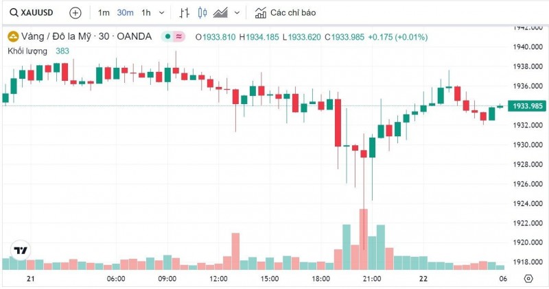 Trong khi đó, vàng thế giới tiếp tục trượt dài, xuống mốc 1934 USD.
