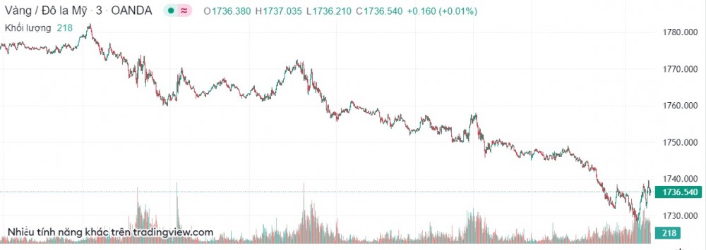 Theo Kitco, giá vàng thế giới giao ngay giảm xuống 1.736 USD/ounce. Giá vàng giao tháng 12 cũng giảm xuống 1.749 USD/ounce.