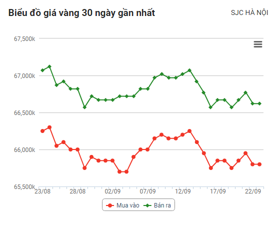 Công ty Vàng bạc đá quý Sài Gòn niêm yết giá vàng SJC tại thị trường Hà Nội ở mức 65,80 triệu đồng/lượng chiều mua vào, 66,65 triệu đồng/lượng bán ra.