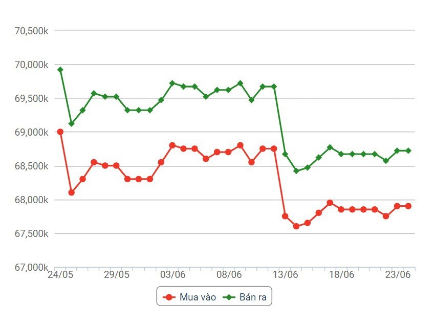 | Giá vàng hôm nay 24/6: SJC giao dịch trên 68 triệu bán ra |