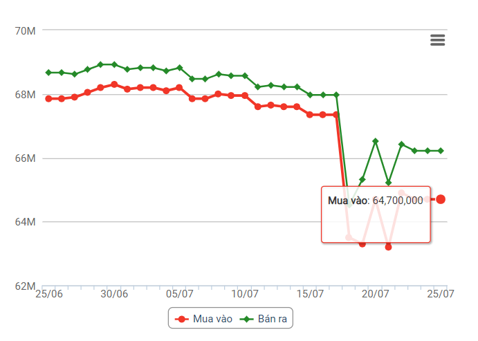 | Giá vàng hôm nay 24/7: Giá bán ra hơn 66 triệu đồngGiá vàng hôm nay 25/7: Giá vàng SJC ở mốc trên 64 triệu đồng/lượng mua vào |