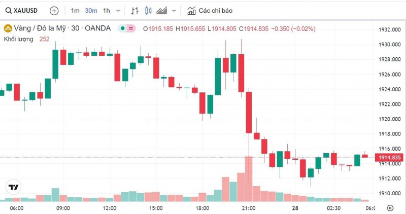 Trong khi đó, vàng thế giới trượt giá nhẹ, xuống mốc 1914 USD.