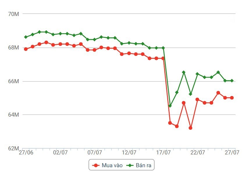 | Giá vàng hôm nay 26/7: Vàng mua vào 65 triệu đồng/lượngGiá vàng hôm nay 27/7: Vàng chịu áp lực, SJC giảm 300 nghìn đồng |