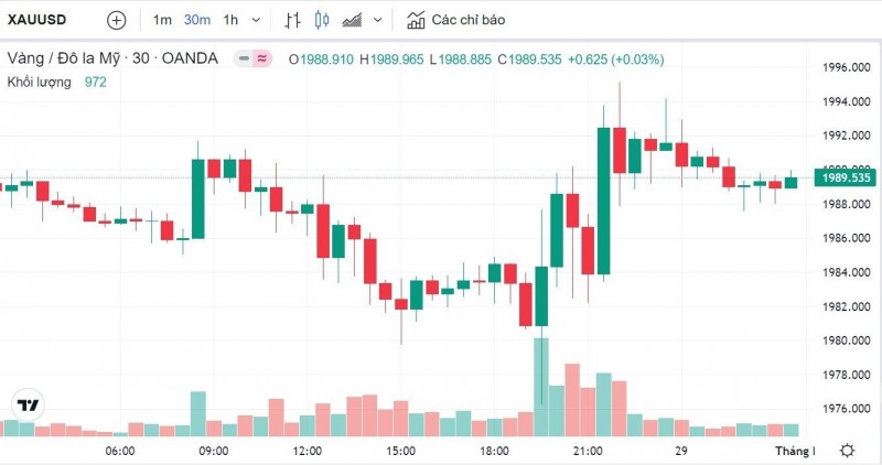 Trong khi đó, vàng thế giới tăng nhẹ, đạt mốc 1989 USD.