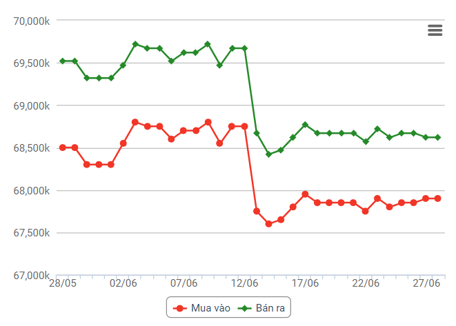 | Giá vàng hôm nay 27/6: Vàng SJC bán ra gần 69 triệu đồngGiá vàng hôm nay 28/6: Vàng SJC tăng 100.000 đồng |