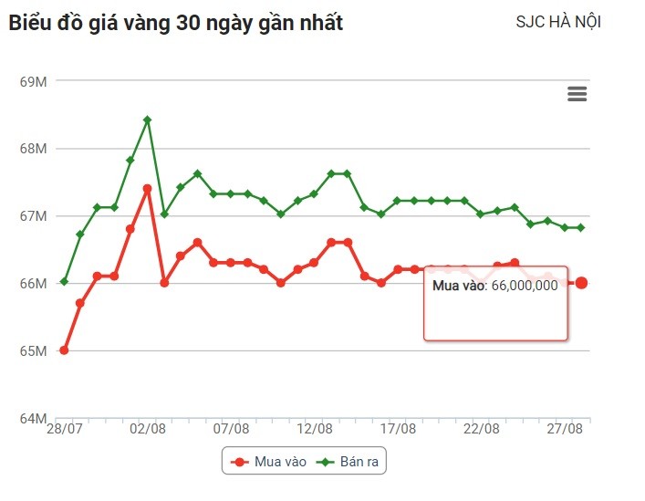 | Giá vàng hôm nay 26/8: Vàng 9999 giảm 200 nghìn đồngGiá vàng hôm nay 27/8: Vàng 9999 neo mức 66 triệu cả 2 chiềuGiá vàng hôm nay 28/8: Giá vàng 9999 giảm mạnh phiên cuối tuần |