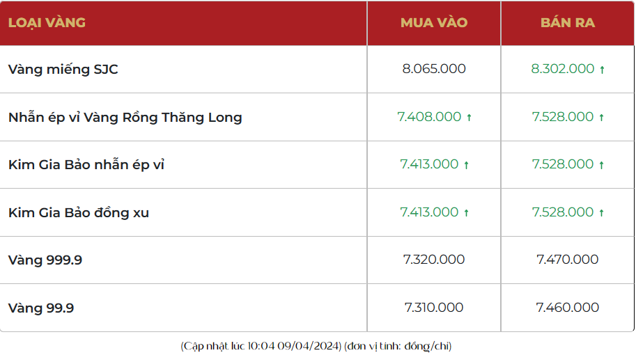 Thời điểm trưa ngày 9/4, giá vàng trong nước tăng mạnh theo đà tăng của giá vàng thế giới. Hiện giá vàng SJC tại Công ty Vàng bạc đá quý Sài Gòn khu vực TP. Hồ Chí Minh giao dịch quanh mức 81,00 - 83,00 triệu đồng/lượng, tăng 1,2 triệu đồng/lượng chiều mua và tăng 1,2 triệu đồng/lượng chiều bán so với chốt phiên hôm qua. Chênh lệch mua - bán là 2 triệu đồng/lượng.