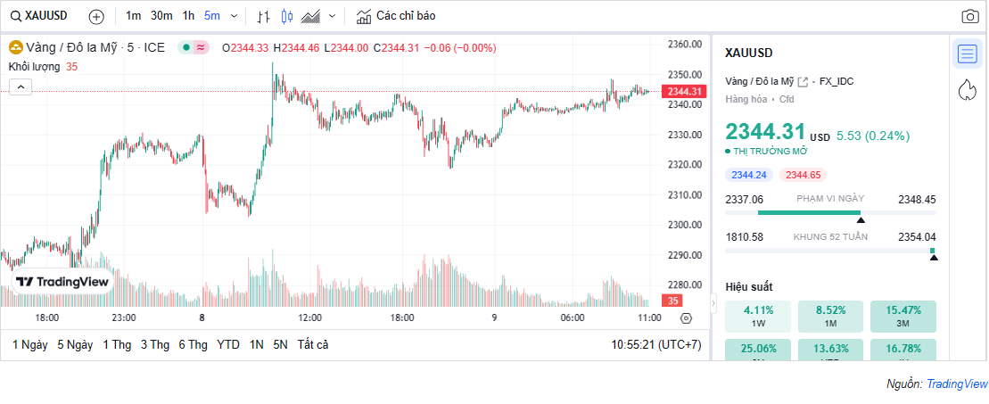 Thời điểm trưa ngày 9/4 theo giờ Việt Nam, giá vàng thế giới đứng ở mức 2.344 USD/ounce, tăng mạnh tới 26 USD/ounce so với cùng giờ sáng qua. Hôm qua, giá vàng lao dốc khi mở cửa phiên tuần mới, tuy nhiên lại ngay lập tức tăng mạnh sau đó, lên mức cao kỉ lục mới 2.354 USD/ounce.