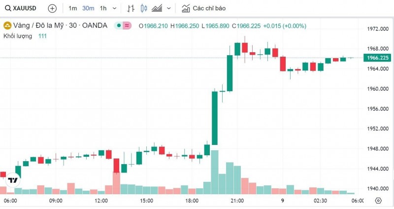 Trong khi đó, vàng thế giới tăng mạnh, hiện ở mốc 1965 USD.