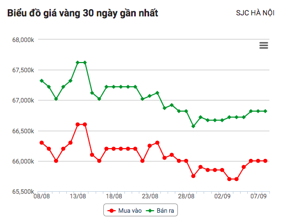 Giá vàng hôm nay 9/9, giá vàng trong nước tăng nhẹ, với mức tăng từ 150 nghìn đồng/lượng đến 300 nghìn đồng/lượng, tiến sát ngưỡng 67 triệu đồng/lượng bán ra. Chênh lệch giá vàng mua bán khoảng 800.000 đồng.