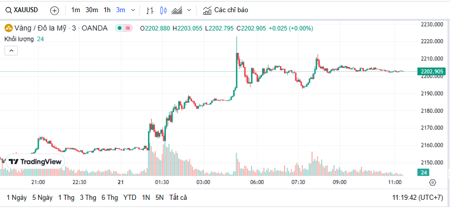 Giá vàng thế giới trưa nay lên mức 2.202 USD/ounce, cao nhất trong năm qua. Với mức giá ở thời điểm hiện tại, thì giá vàng thế giới quy đổi sang VND (đã tính thuế, phí gia công) đang ở mức 67,03 triệu đồng/lượng, như vậy, chênh lệch giữa giá vàng SJC trong nước và thế giới rơi vào khoảng 14,79 triệu đồng/lượng.