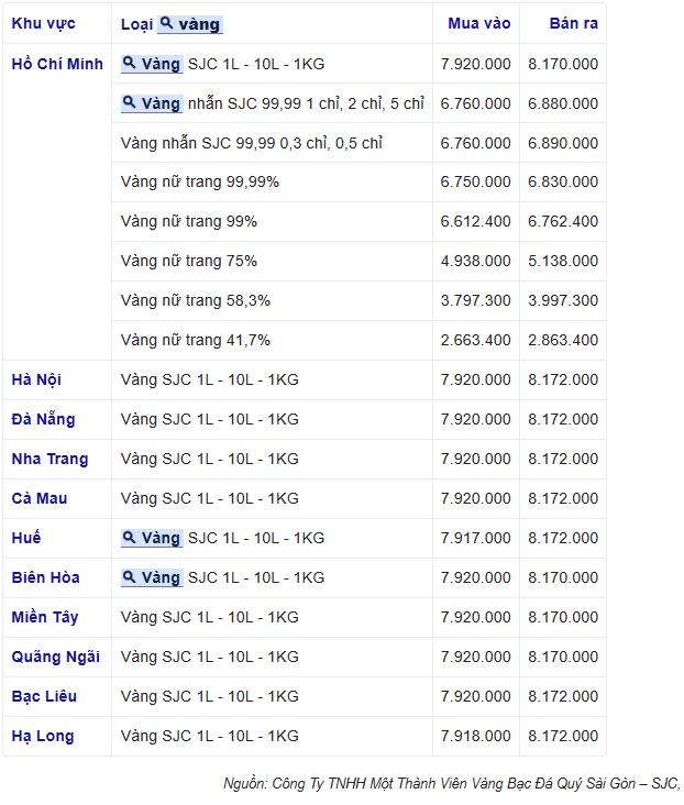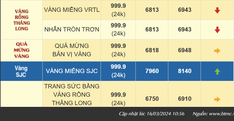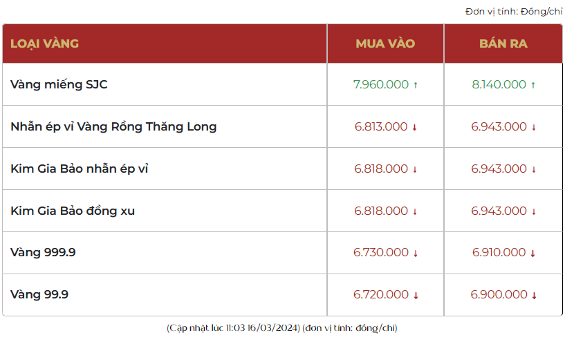 Thời điểm trưa ngày 16/3, giá vàng SJC giao dịch tại Công ty Vàng bạc đá quý Sài Gòn khu vực TP. Hồ Chí Minh quanh mức 79,20 - 81,70 triệu đồng/lượng, giảm 500 ngàn đồng/lượng chiều mua và tăng 100 ngàn đồng/lượng chiều bán so với chốt phiên hôm qua. Chênh lệch mua - bán là 2,5 triệu đồng/lượng.