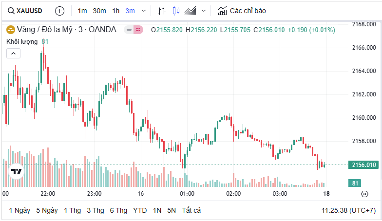 Giá vàng thế giới trưa nay giao dịch ở mức 2.156 USD/ounce, giảm nhẹ gần 6 USD mỗi so với phiên trước. Hiện giá vàng thế giới quy đổi theo tỉ giá niêm yết vào khoảng 64,7 triệu đồng/lượng, thấp hơn vàng nhẫn trên 4 triệu đồng và thấp hơn vàng SJC trên 16,5 triệu đồng/lượng.