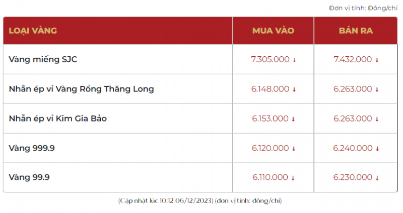 Vàng trang sức bằng Vàng rồng Thăng Long 999.9 (vàng 24k) của doanh nghiệp này giao dịch quanh mức 61,20 - 62,40 triệu đồng/lượng mua vào - bán ra, giảm 200 ngàn chiều mua vào và giảm 100 ngàn bán ra so với ngày hôm qua. Vàng trang sức bằng Vàng rồng Thăng Long 99.9 (vàng 24k) đang giao dịch quanh mức 61,10 - 62,30 triệu đồng/lượng mua vào - bán ra, giảm 200 ngàn chiều mua vào và giảm 250 ngàn chiều bán ra so với ngày hôm qua.